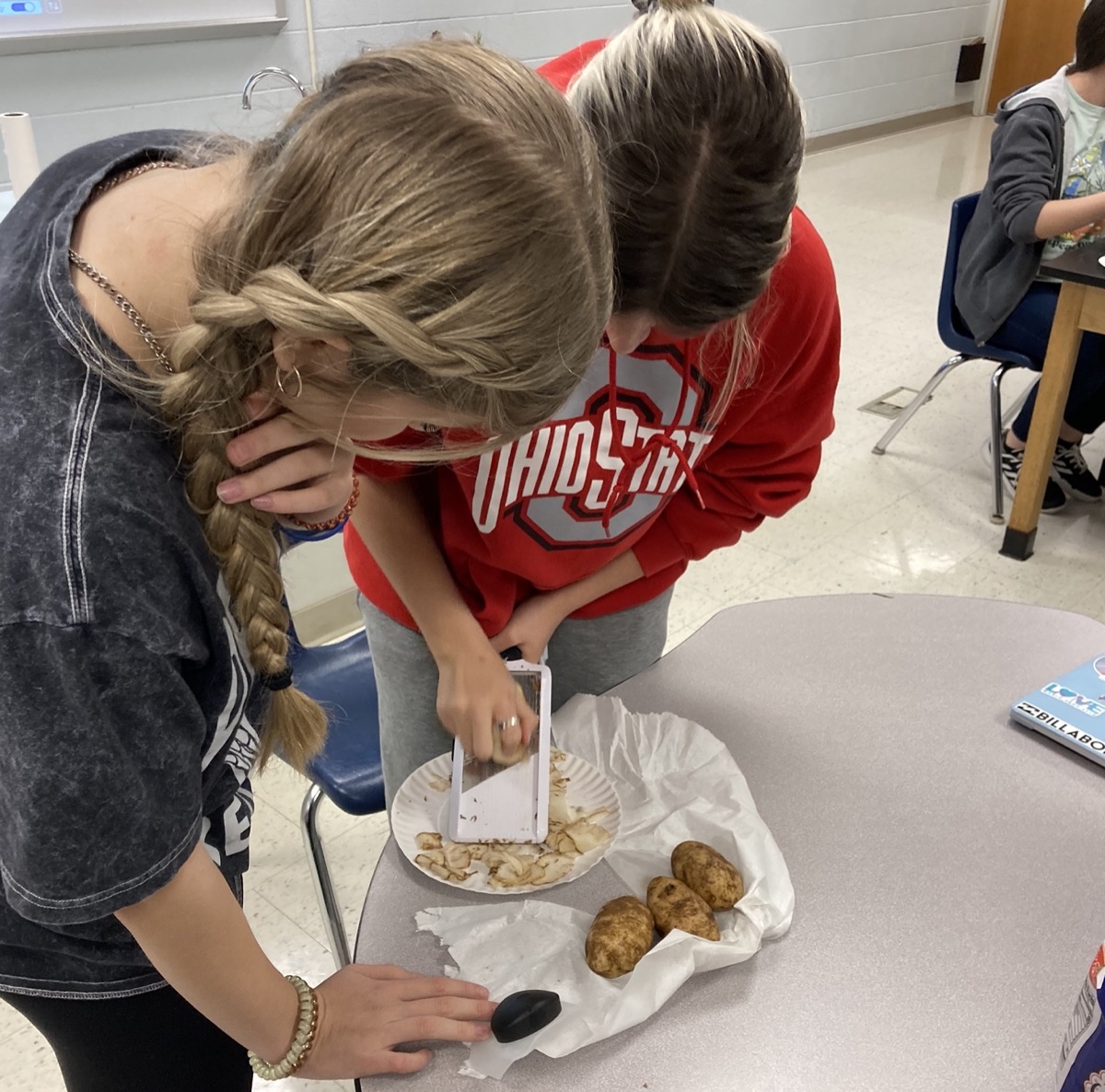 "We did the browning of potato chips over two days. On the first day, students washed their potatoes and sliced them using a mandolin slicer. They then put them into cups and submerged them in water. One cup had sugar added to it and one acted as the control.