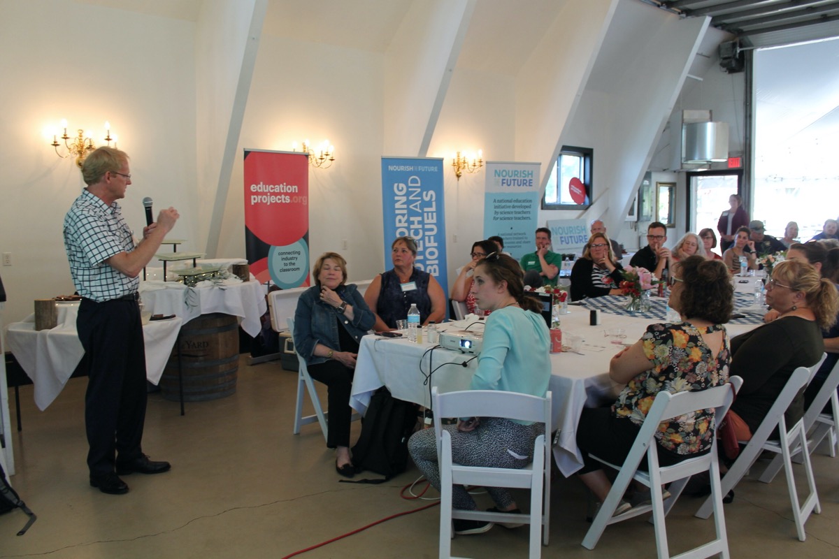 A dinner held at The Yard in Minnesota provided an evening of interaction with industry experts. Two North Dakota State University bioproducts researchers shared about their field. Dean Webster helped teachers make connections between the subjects they teach and bioresearch products. Jim Bahr talked about the process of developing a bioproduct and taking it to market, using the example of a dust suppressant product he helped create.