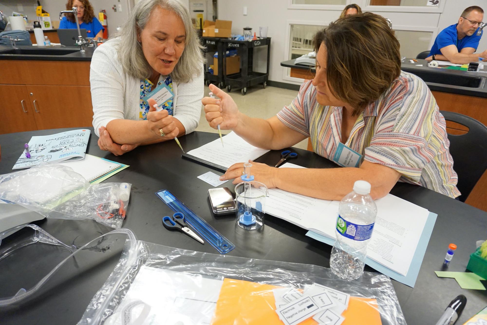Presenters Jennifer Foudray, Erin Molden, Rachel Sanders, and Pam Snyder led participants through lab activities focused on biotechnology, food science, and biofuels. The teachers worked on biotech skills such as pipetting, developed and tested protocols for extracting DNA, enacted a human model of a DNA nucleotide, created a paper model of a RoundUp ready soybean plant, and ran a gel electrophoresis. They also developed biofuels from plant oils, tested biodiesel for chemical properties, performed a sensory analysis of the performance of different vegetable oils, and made mayonnaise.
