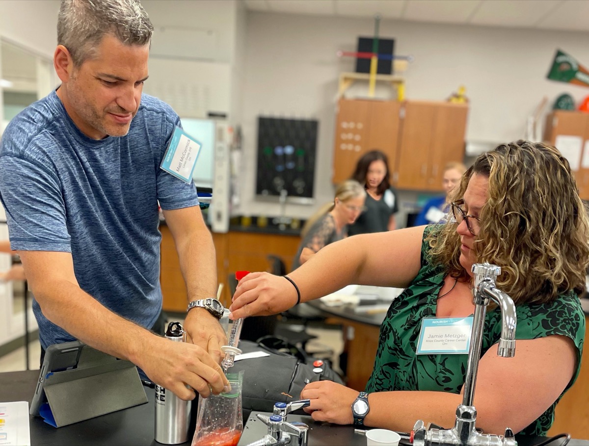 The Science of Food and Fuel: Nourish the Future Ag Biotech workshop held in June included Nourish the Future lessons presented in a unique manner. A group of 28 teachers gathered in-person at Global Impact STEM Academy in Springfield, Ohio, while another 28 joined in via Zoom for a unique science learning experience.
