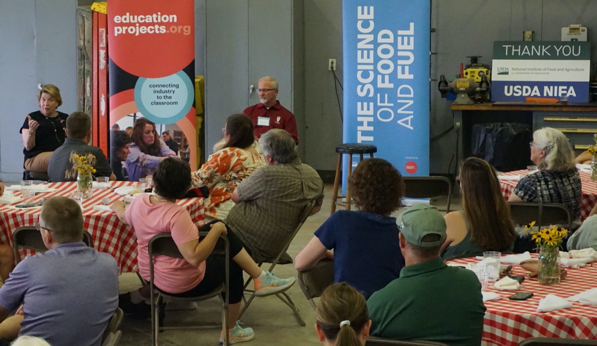 A key part of workshops facilitated by educationprojects.org is the industry dinner, bringing together experts in different agriculture-related fields to talk with the teachers about their careers, experiences, and challenges. This dinner took place at OSU’s Western Agriculture Station. After teachers observed some trial plantings and heard about the research done at the station, NCGA President John Linder and educationprojects.org's founder and CEO Jeanne Gogolski talked about their educational backgrounds, career paths, and goals. “Farmers care about what they do—they are in it for the long haul, and so are teachers,” Gogolski said. Ohio AgNet’s Dale Minyo led a question and answer session where farmers and teachers shared about the problems they face and discussed ways to work together to reach the next generation of skilled workers.